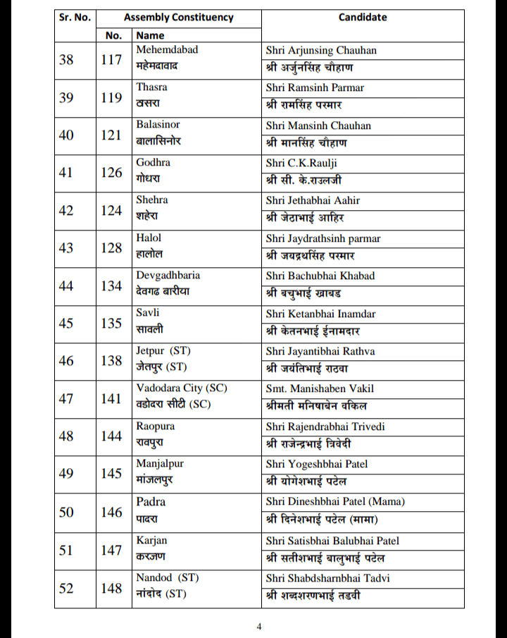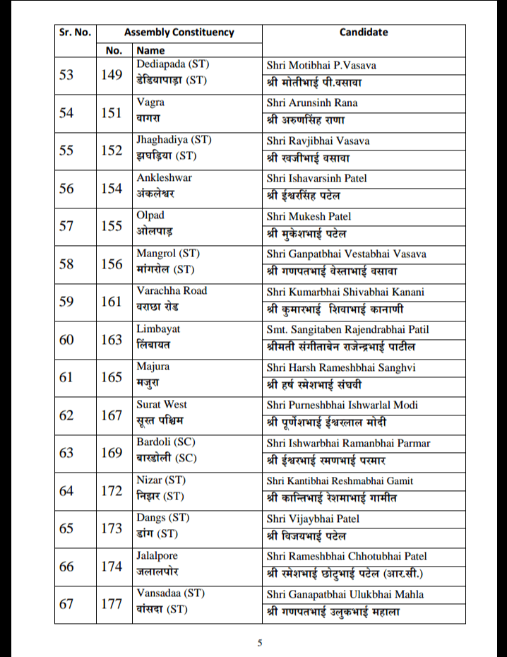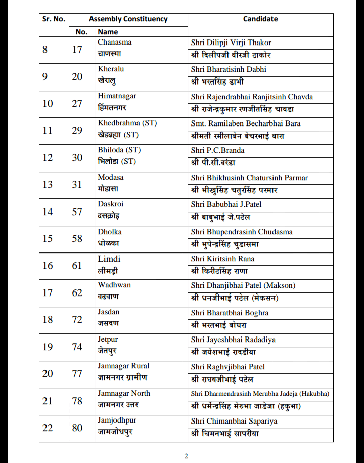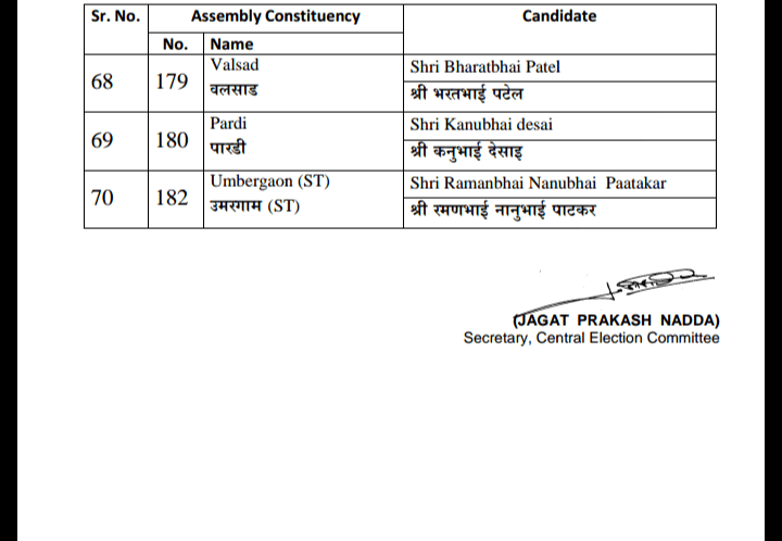 જેની ઉત્સુકતા પૂર્વક રાહ જોવાઈ રહી હતી તે પ્રથમ વિધાનસભા ઉમેદવારોની પ્રથમ યાદી ભાજપે જાહેર કરી છે. જેમા કચ્છ માથી ફકત વાસણભાઇ આહીર નો અંજાર સીટ પર નામ જાહેર કરાયો છે. યાદી નીચે મુજબ છે.