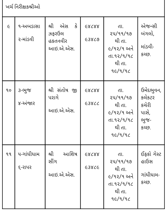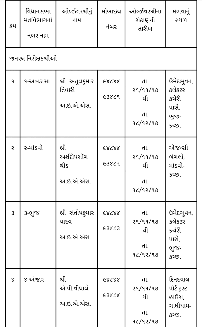 ભુજ, ગુરૂવાર : ભારતના ચુંટણી પંચ દ્વારા ગુજરાત વિધાસભા સામાન્ય ચુંટણીઓ-૨૦૧૭ માટેની તારીખો જાહેર કરવામાં આવી છે. કચ્છ જિલ્લામાં મતદાનની પ્રક્રિયા તા.૯/૧૨/૨૦૧૭ના હાથ ધરવામાં આવનાર છે. આ સમગ્ર ચુંટણી પ્રક્રિયા મુકત અને ન્યાયી વાતાવરણમાં યોજાય તે માટે ચુંટણીપંચ દ્વારા કચ્છ જિલ્લાની ૬ (છ) વિધાનસભા મતવિસ્તાર માટે જનરલ નિરોક્ષકો, ૩ (ત્રણ) ખર્ચના નિરીક્ષકો તથા ૨ (બે) પોલીસ નિરીક્ષકોની નિમણુંક કરવામાં આવી છે. તમામ નિરીક્ષકો કચ્છ જિલ્લામાં આવી ગયેલ છે. સામાન્ય જનતા ચુંટણી સબંધી કોઇપણ પ્રકારની ફરિયાદ માટે તેઓશ્રીનો કોસ્ટકમાં જણાવેલ સ્થળે તેમજ મો.નં. ઉપર સંપર્ક કરી શકશે. તેઓનો કાર્યક્રમ નીચે વિગતે છે.